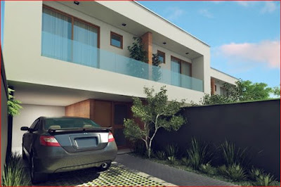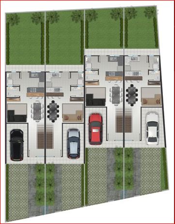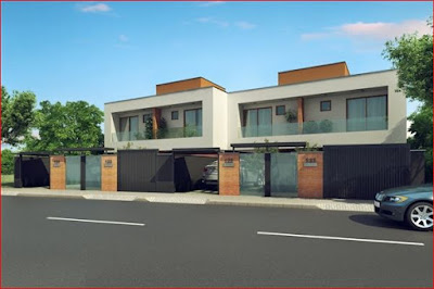 Os geminados são mais altos em relação a rua pavimentada, espaço na frente para duas vagas de carro e nos fundos espaço com aproximadamente 7 metros, ideal para uma área de festas com piscina